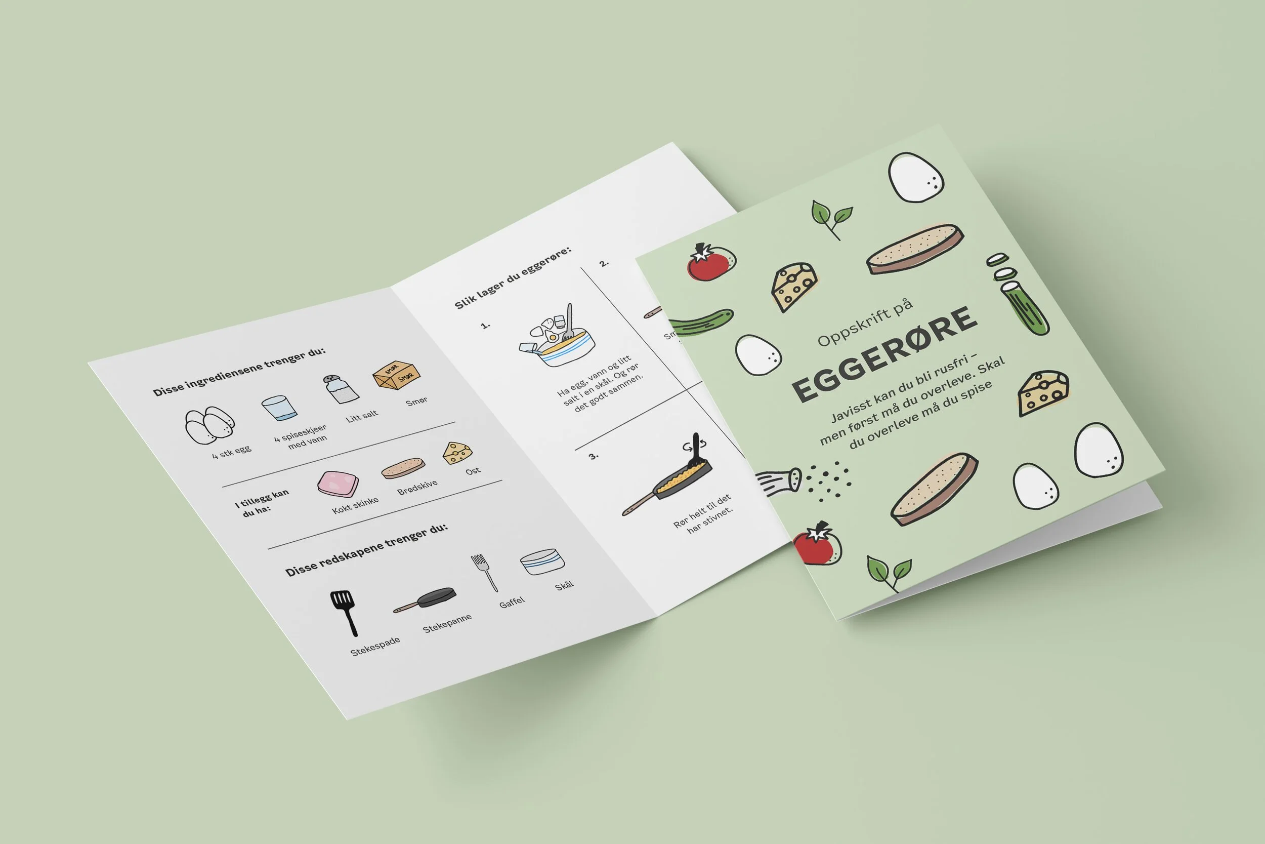 Korus jobber for å øke kompetansen og utvikle tjenester til rusavhengige. I dette prosjektet var ønsket at rusavhengige skulle få tilgang til enkle brosjyrer med oppskrifter på mat som de både kan lage og spise. Jeg har laget enkle, morsomme og beskrivende illustrasjoner som kan forstås av de som kan lese norsk – og de som ikke kan. Illustrasjonene kan assosieres med barneboktegninger, og gir derfor en positiv stemning.